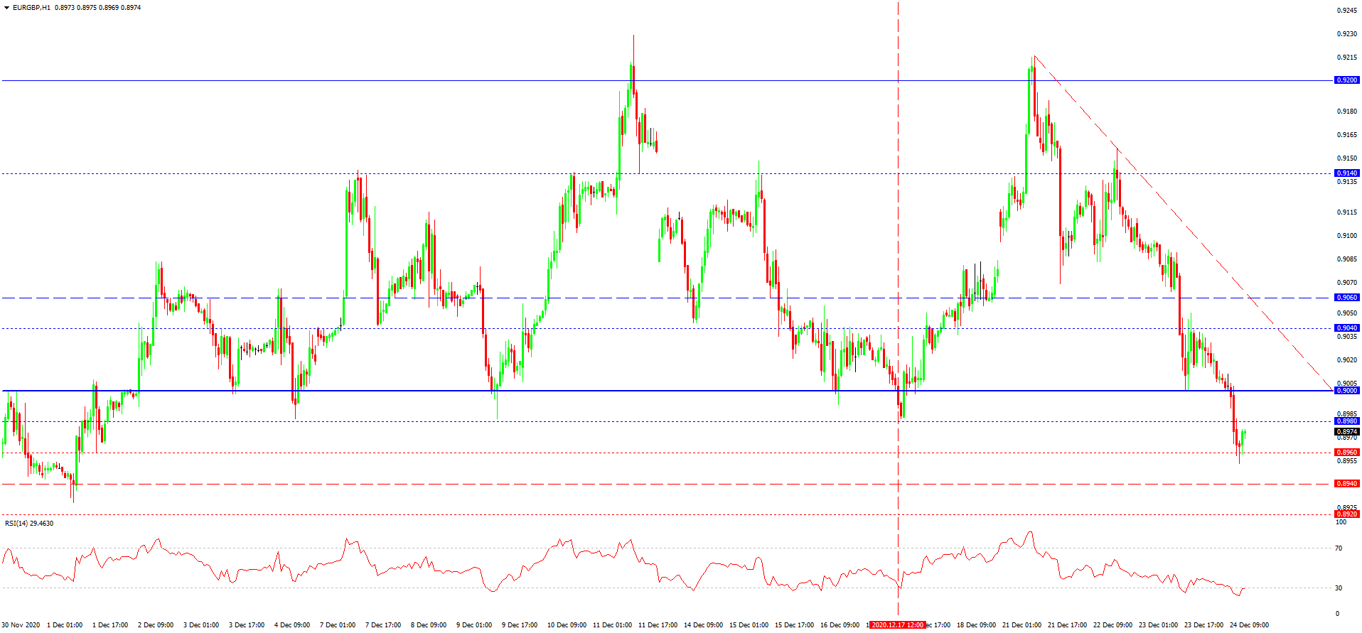 از دفعه گذشته به تاریخ 17 دسامبر که در رابطه با این جفت ارزی نوشته بودیم، نرخ گذاری ها برای بار دوم به مینیموم هیجانی و موضعی 0.9000 اصابت کرده بودند. انتظار می رفت تا با انعکاس گرایشی و از سر گیری افزایش قیمت یورو رو به رو شویم. این افزایش شروع شد و نرخ گذاری ها تا مرز ماکسیموم 0.9200 افزایش پیدا کردند. افت دوباره یورو به موازات تقویت پوند که همراه با مثبت شدن پیش زمینه خبری برکسیت رخ داد، نرخ گذاری ها را دوباره تا مرز 0.9000 پایین آورد. اخیرا قیمت به زیر این سطح نیز نزول نمود و تا مرز 0.8960 نیز کاهش یافته. افزایش پوند با خوش بینی های برکسیت همواره ادامه داشته و پتانسیل صعودی دلار در بلند مدت یورو را بیشتر از همیشه تضعیف می کند. تحکیم یابی بیشتر دلار می تواند نرخ گذاری های این جفت ارزی را تا مرز 0.8940 و حتی خط روند صعودی و سطح 0.8900 نیز سوق دهد. چرا که پوند هم به افزایش خود فعلا ادامه می دهد. پتانسیل افزایش اصلاحی این جفت ارزی تا مرز 0.8980 می باشد.