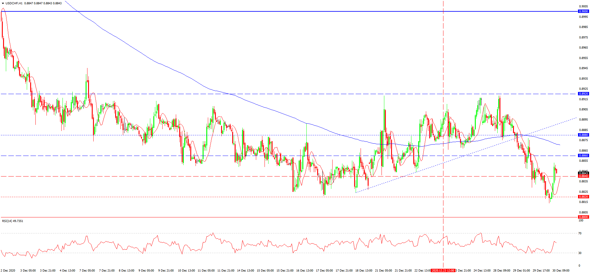 از دفعه گذشته به تاریخ 23 دسامبر که در مورد این جفت ارزی نوشته بودیم، نرخ گذاری ها به افزایشی کند اما مستحکم در بطن کانالی صعودی ادامه می دادند. افزایش تا مرز ماکسیموم 89.20 ادامه یافت و سپس با افت دوباره تا نهاد بازار و مینیموم 0.8820 رو به رو شدیم. بانک سوئیس یکی از سفته بازان بزرگ دهه اخیر، کلا دوست ندارد تا نرخ فرانک نسبت به دلار افزایش شدید پیدا کند. وابستگی نرخ فرانک و در کل این جفت ارزی از طلا بیشتر است تا از دلار. به همین دلیل باید به فشرگی نوسانی طلا در حوالی خط روند صعودی نیز توجه کرد. سیگنالی که شاید مبنی بر احتمال از سر گیری روند صعودی نرخ این دارایی در آینده باشد. در صورتی که اخبار های مثبت در رابطه با پروسه واکسینه در بریتانیا و آمریکا دوباره رسانه ها را پر کند (که البته فعلا بعید به نظر می رسد)، می توان با ضربان نزولی طلا قبل از از سر گیری افزایش رو به رو شد. پتانسیل ضربان نزولی پشتیبانی 1870 می باشد. احتمالا بعد از تست این سطح و یا حتی قبل از رسیدن به آن، افزایش قیمت طلا از سر گرفته خواهد شد که باعث می شود نرخ این جفت ارزی مینیموم موضعی را بشکاند.
