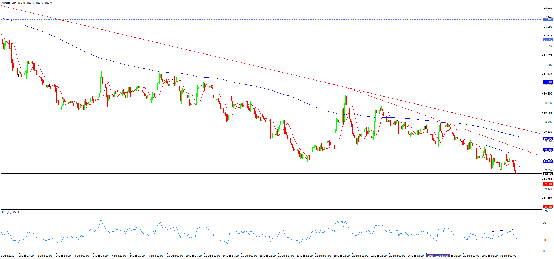 از دفعه گذشته به تاریخ 28 دسامبر که در رابطه با دلار نوشته بودیم، نرخ شاخص به مینیموم 89.80 فشرده شده بود و احتمال می رفت تا در صورت عدم شکست مقاومت 90.20-90.40 مینیموم یاد شده بشکند و نرخ گذاری ها تا مرز مینیموم تاریخی 90.60 نیز افت نمایند. خوش بینی های مربوط به محرک مالی، تلاش ترامپ، انتخاب دوباره نانسی پلوسی به منظور ریاست در سنا ایالات متحده، عواملی هستند که به این کاهش نرخی دلار کمک نمودند. البته با این وجود، این افت از ضربان بسیار پایینی برخوردار بوده و واگرایی شیپور مانند روند نرخی در نمودار یک ساعته، با ایجاد واگرایی بین خط شاخص RSI و روند کوتاه مدت نرخ دلار، می تواند مبنی بر احتمال از سر گیری افزایش اصلاحی قیمت این شاخص در هر لحضه به صورت کوتاه باشد. این اصلاحی نرخی می تواند بعد از تست 89.20 هم رخ دهد.