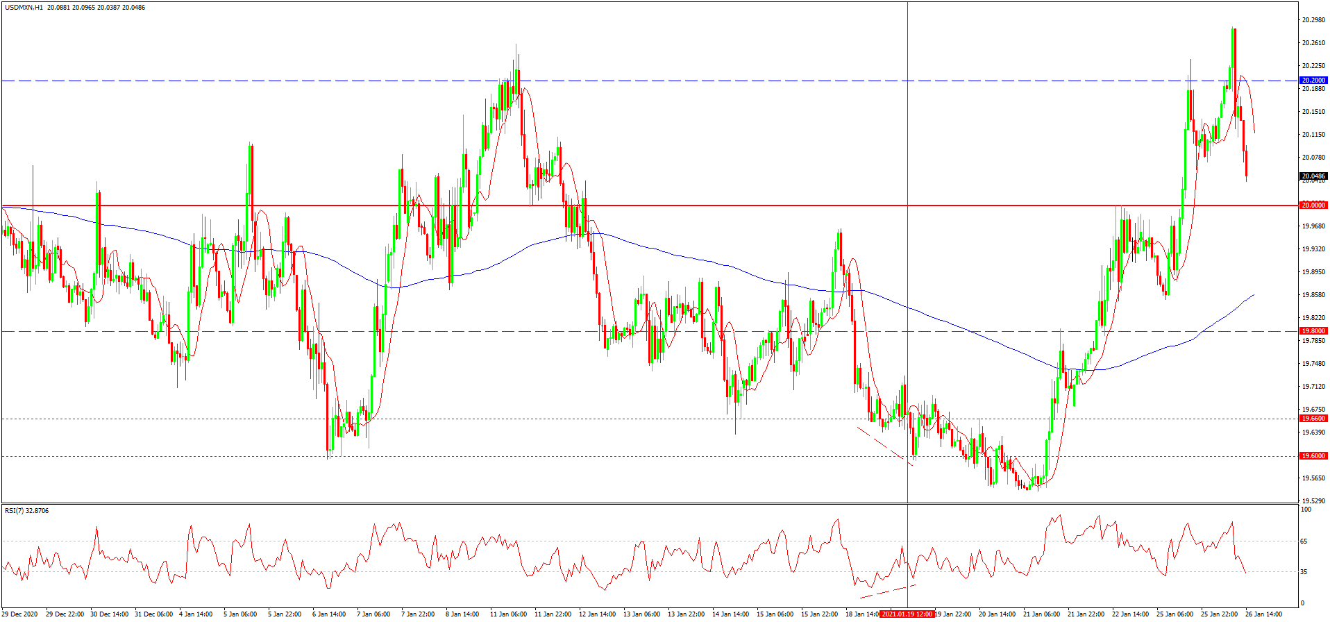 از دفعه گذشته به تاریخ ۱۹ ژانویه که در مورد این جفت ارزی نوشته بودیم، نرخگذاریها در آستانه برخورد با مینیموم تاریخی ۱۹٫۶ دچار فشردگی نوسانی شده بودند. همگرایی ایجادشده بین خط روند چندروزه و خط نوسانگر RSI نمودار ساعتی بعد از برخورد قیمت با مینیموم و ایست روند نزولی به ازسرگیری افزایش میانمدت انجامید. افزایش قیمت تا مرز ۲۰٫۲ ادامه یافت. در حال حاضر با کاهش یابی قیمت دلار از رأس بازار روبهرو هستیم، که در صورت عدم تضعیف قیمت نفت در آینده نزدیک میتواند ادامهدار شود. چنین سناریویی مبنی برافت بیشتر قیمت این جفت ارزی تا مرز ۱۹٫۸ میباشد. عدم افزایش بیشتر قیمت نفت تا قبل از شکست پشتیبانی ۲۰ نمودار USD/MXN از کاهش بیشتر این جفت ارزی جلوگیری خواهد نمود.