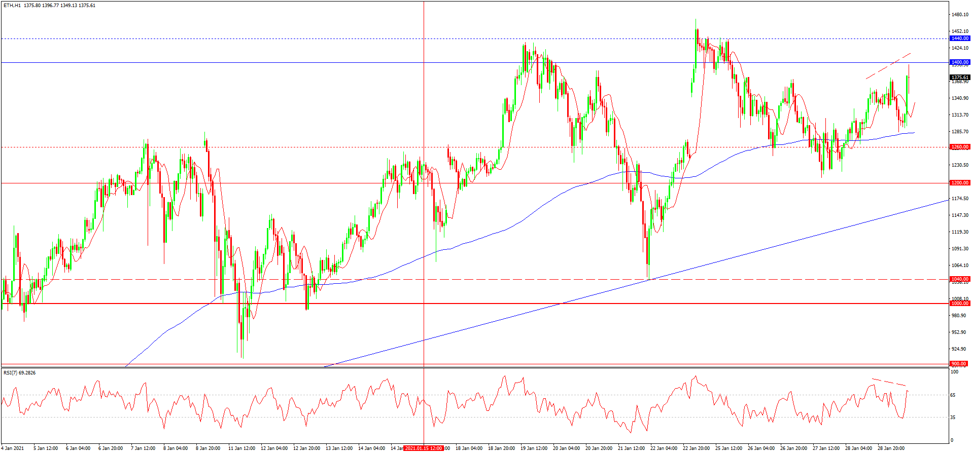 از دفعه گذشته به تاریخ 15 ژانویه که در مورد این رمزارز نوشته بودیم، نرخ گذاری ها بعد از ایجاد واگرایی بین روند روزانه و خط نوسانگر، افت اصلاحی را آغاز نمودند و تا مرز مینیموم 1060 سقوط کردند. دیرتر روند به فاز اصلی برگشت و با افزایش قیمت اتریوم تا ماکسیموم 1440 هم برخورد کردیم. در حال حاضر قیمت دوباره در حال نزدیک شدن به این ماکسیموم است. واگرایی که هم اکنون رخ داده می تواند سیگنال افت اصلاحی قبل از رسیدن قیمت به ماکسیموم ها باشد.