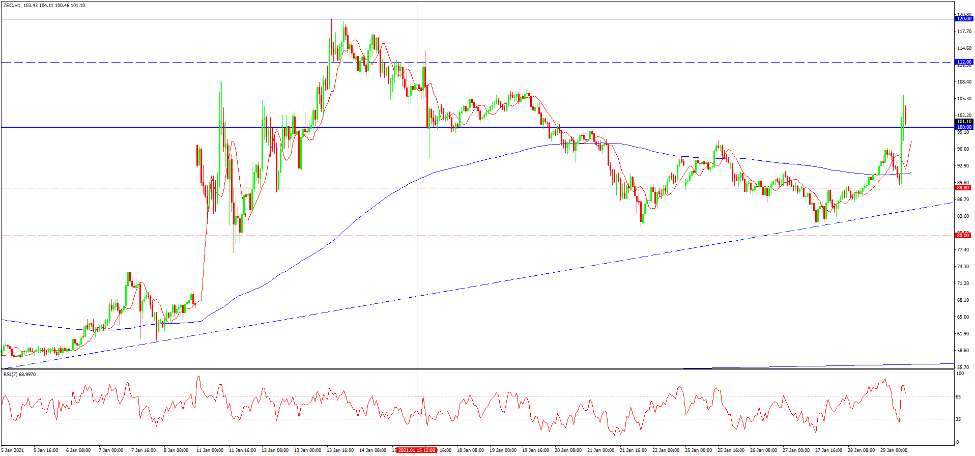 از دفعه گذشته به تاریخ 15 ژانویه که درمورد این رمزارز نوشته بودیم، نرخ گذاری ها نشان می دادند که با واگرایی بلند مدت بین خط روند 11 ژانویه و خط نوسانگر رو به رو هستیم، که سیگنال از سر گیری افت میان مدت بود. افت با کاهش یابی ماکسیموم ها شروع شد و قیمت را تا مرز 80 پایین آورد. اخیرا قیمت با افزایشی اصلاحی، مرز بالایی کانال افقی و سطح هیجانی 100 را شکانده. در این بین، واگرایی کوتاه مدت نیز بین خط روند روزانه و خط نوسانگر دیده می شود، که می تواند مبنی بر افت اصلاحی باشد.