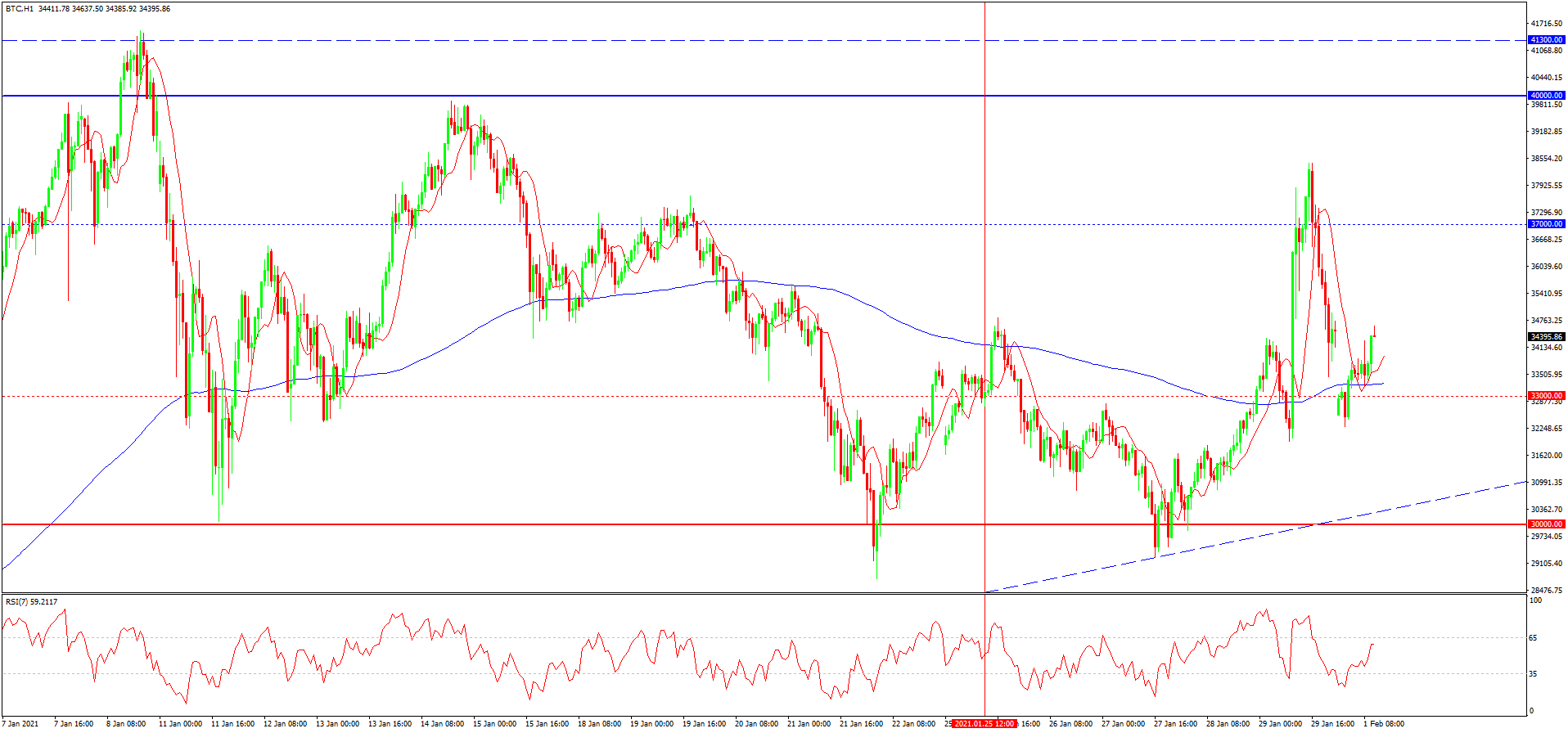 از دفعه گذشته به تاریخ 25 ژانویه که در مورد بیتکوین نوشته بودیم، نرخ گذاری ها با مینیموم 30000 برخورد کرده بودند و افزایش قیمت باید ادامه پیدا می کرد. اما بعد از ایجاد واگرایی بین نرخ گذاری و خط نوسانگر، روند نزولی دوباره تقویت پیدا کرد. افت به تست دوباره مینیموم یاد شده انجامید و تنها بعد از آن، افزایش تا سطح هدفی 37000 ادامه یافت. پیش زمینه خبری اخیرا بسیار منفی شده و با احتمال ادامه یابی روند نزولی رمزارز در آینده نزدیک رو به رو هستیم.