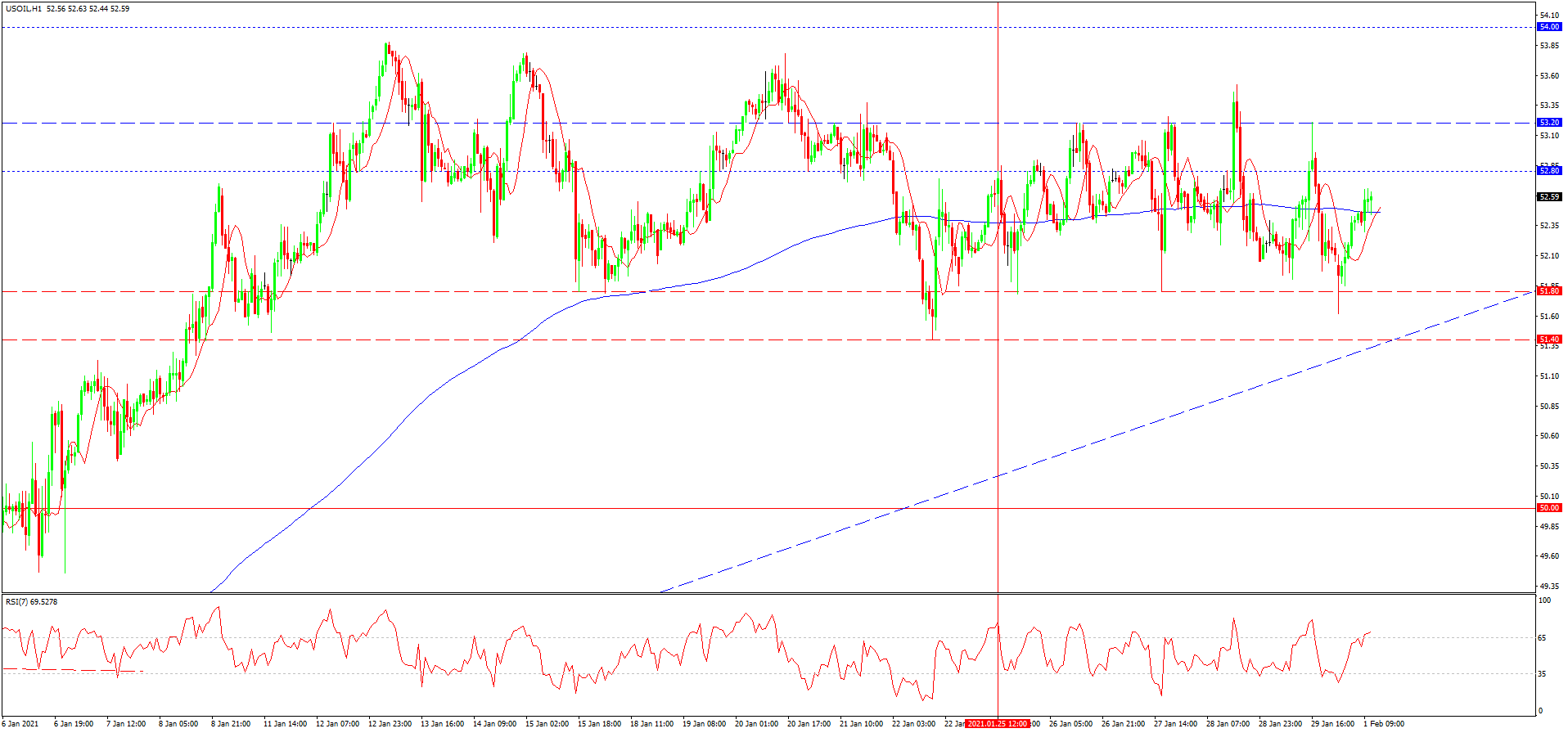 از دفعه گذشته به تاریخ 25 ژانویه که در مورد نفت نوشته بودیم، نرخ گذاری ها مینیموم 51.80-51.40 را تست کرده بودند و تا مرز 53.20 افزایش یافت. روند در حال حاضر در بطن کانال افقی 51.80-53.20 ادامه داشته و برخورد به زود قیمت با مینیموم ها و خط روند شاید از سر گیر افزایش دوباره را به دنبال داشته باشد. در صورتی که سیاست آتی جو بایدن فضای متشنج خاورمیانه را آرام کند، شاید روند قیمت نفت بعد از برخورد با مینیموم ها با سرعتی کند بتواند به افزایش ادامه دهد.