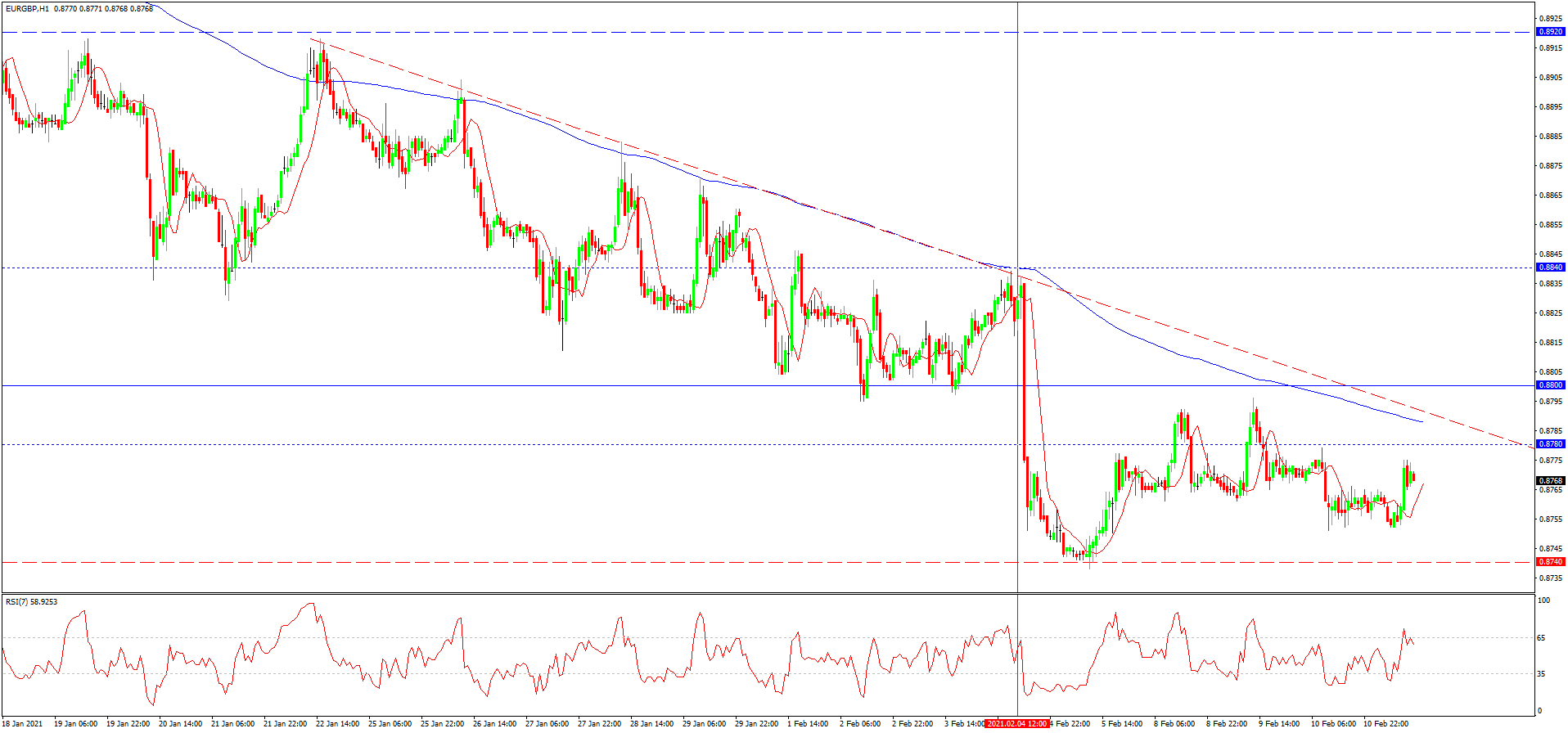 از دفعه گذشته به تاریخ 04 فوریه که در مورد این جفت ارزی نوشته بودیم، نرخ گذاری ها به خط روند نزولی نزدیک شده بودند و احتمال می رفت تا افت قیمت از سر گرفته شود. روند نزولی همراه با تست مقاومت 0.8840 از سر گرفته شد و تا مرز 0.8740 نیز ادامه یافت. افزایشی که در حال حاضر رخ داده به دلیل ضعف دلار و تحکیم یابی یورو نرخ گذاری ها را به خط روند نزولی نزدیک کرده. حتی با وجود فشار شدید خریداران در آینده احتمال شکست مقاومت موضعی 0.8780، برخورد با خط روند نزولی و تست ماکسیموم نزولی 0.8800 نیز وجود دارد.