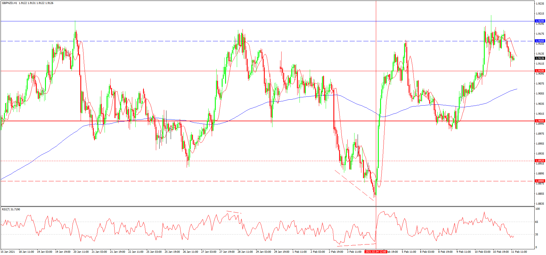 از دفعه گذشته به تاریخ 04 فوریه که در مورد این جفت ارزی نوشته بودیم، با ایجاد هم گرایی بین مینیموم ها و خط نوسانگر رو به رو شدیم، که سیگنال انعکاس گرایش از نهاد بازار را می داد. انعکاس گرایش از نهاد بازار رخ داد و نرخ گذاری بعد از شکست مینیموم 1.8920 تا مرز ماکسیموم تاریخی 1.9200 افزایش یافتند. از سر گیری افت اخیر پوند نسبت به دلار نیوزیلند همراه با تضعیف اخیر دلار ایالات متحده رخ داد و فعلا می تواند تحت فشار دوباره فروشندگان پوند باشد. پتانسیل افت اصلاحی فعلا تا مرز 1.9060-1.9040 می باشد.