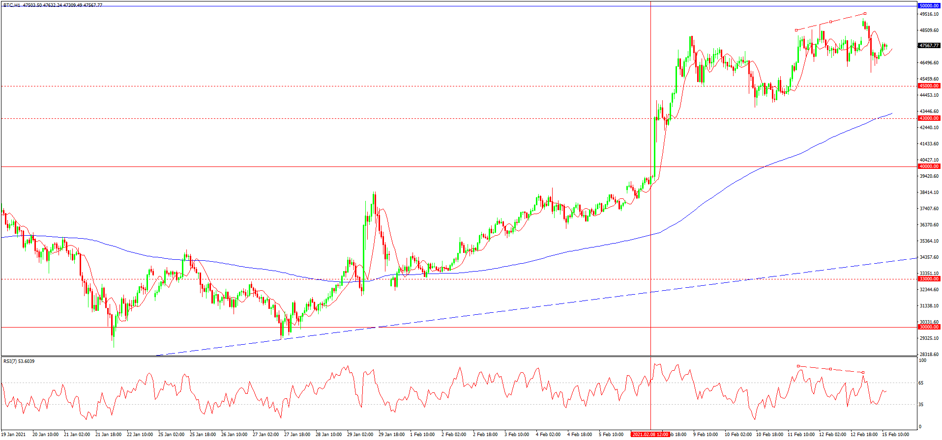 از دفعه گذشته به تاریخ 8 فوریه که در مورد این رمزارز نوشته بودیم، نرخ گذاری ها با فشردگی نوسانی به ماکسیموم 40000 نزدیک می شدند. این فشردکی و نزدیکی به مقاومت هدفی 40 هزار دلار ضربان صعودی، شکست این سطح و افزایش مابعد تا مرز 50000 دلار را به دنبال داشت. فشردگی نوسانی که هم اکنون مشاهده می کنیم با واگرایی اخیرا ایجاد شده بین ماکسیموم ها و خط نوسانگر در نمودار ساعتی می تواند مبنی بر ادامه دار بودن ضعف موقت و کاهش اصلاحی در آینده باشد. پتانسیل این افت فعلا شامال سطوح 45000 و یا 43000 می باشد. بعد از تست شدن این بازه می توان با افزایش بیشتر این رمز ارز تا مرز 70000 نیز رو به رو شد.