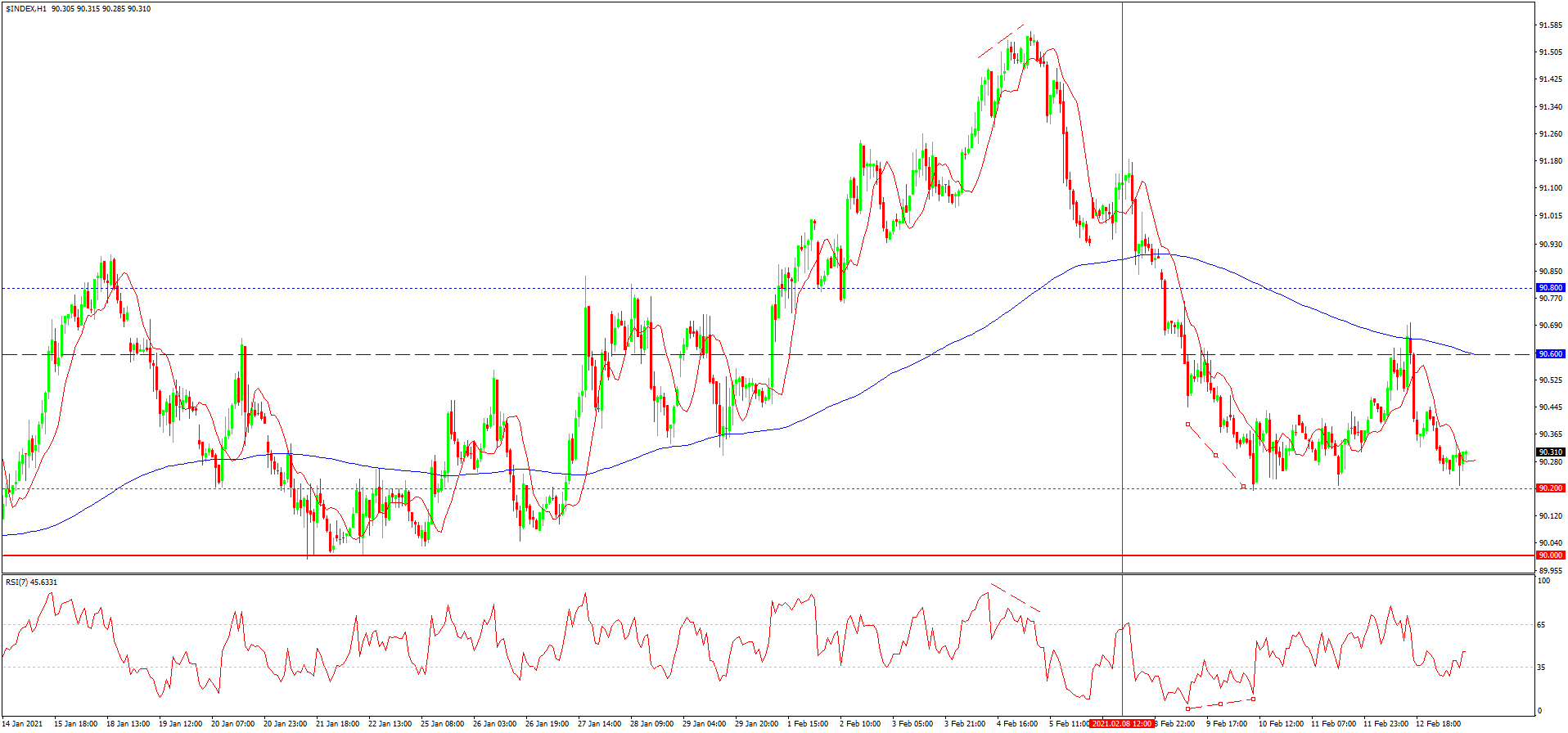 از دفعه گذشته به تاریخ 8 فوریه که در مورد دلار نوشته بودیم، نرخ گذاری ها از 90.70 انعکاس پیدا کرده بودند و واگرایی ایجاد شده به کاهش مابعد تا مرز 90.80 و افت بیشتر تا نزدیکی مینیموم موضعی و پشتیبانی 90.20 نیز انجامید. اخیرا کاهش قیمت بعد از نزدیکی با مینیموم موضعی متوقف شده و با در نظر گیری نزدیک بودن قیمت به سطح هیجانی 90.00 می توان با احتمال انعکاس آتی قیمت دلار نیز رو به رو بود. البته فشردگی نوسانی در نزدیکی این سطح هیجانی فعلا احتمال کاهش بیشتر دلار را می دهد. به همین دلیل فعلا و تا قبل از تحکیم یابی نرخ این شاخص بالای 90.40-90.60 می توان با ادامه یابی روند نزولی رو به رو بود. البته بعد از ضربان نزولی شاید با انعکاس قیمت رو به رو شویم.