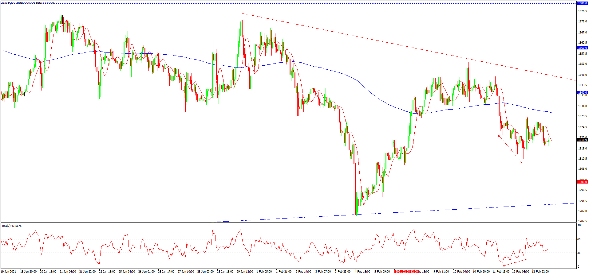 از دفعه گذشته به تاریخ 8 فوریه که در مورد این دارایی نوشته بودیم، نرخ گذاری ها از خط روند صعودی انعکاس پیدا کرده بودند و قیمت طلا از مینیموم 1780 تا مرز 1840 افزایش پیدا کرده بود. دیرتر تشنج ایجاد شده به دلیل اخبار مربوط به شیوع ویروس جهش یافته در سطح جهان از طریق پیش زمینه خبری قوی واکسن دفع شد و در طول هفته اخیر به دلیل کاهش احتمال ریزش سهام از طریق تصویب لایحه محرک مالی و پایین بودن سطح شیوع ویروس، نرخ طلا تحت فشار قرار گرفت اما از خط روند عبور نکرده و هنوز هم بالای سطح 1800 دلار قرار دارد. هم گرایی اخیرا ایجاد شده در نمودار ساعتی می تواند احتمال از سر گیری روند صعودی نرسیده به مینیموم 1800 را دهد. در هر صورت این افزایش اصلاحی فعلا تا مرز خط روند نزولی و 1840-1860 دلار شاید ادامه داشته باشد و تا قبل از شکست این بازه نمی توان به ادامه یابی روند صعودی طلا مطمئن بود.