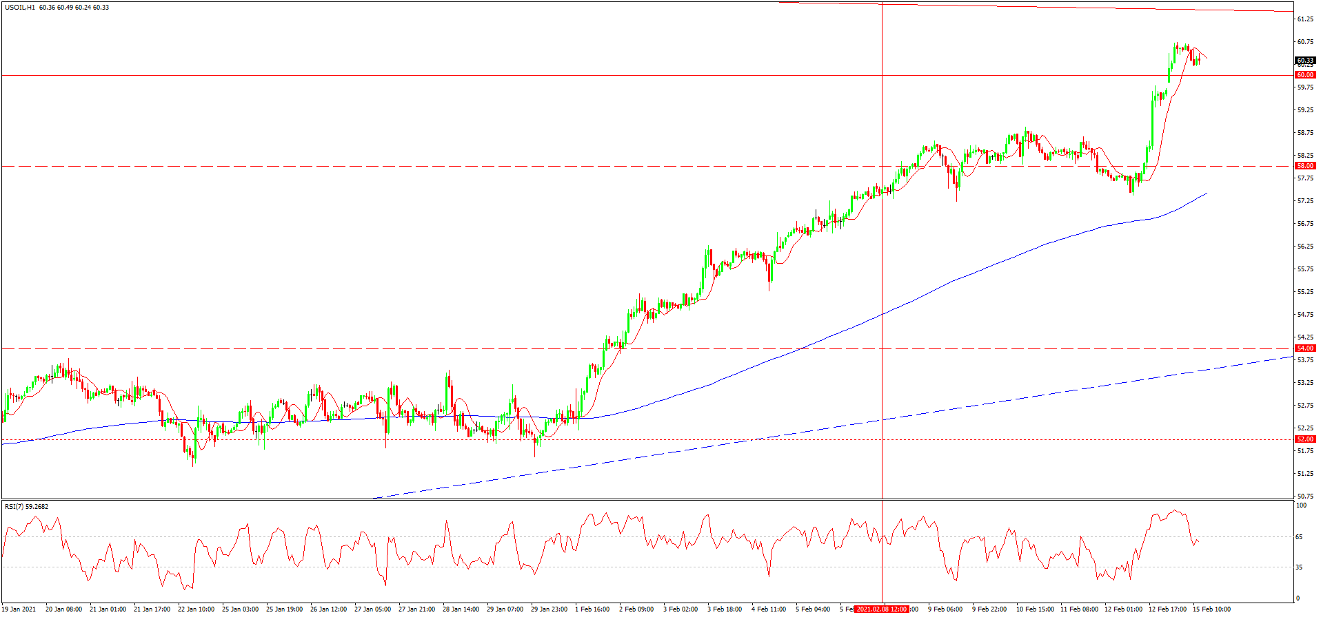 از دفعه گذشته به تاریخ 8 فوریه که در مورد طلای سیاه نوشته بودیم، نرخ گذاری ها با فشردگی نوسانی به افزایش ادامه می دادند و بهبود پیش زمینه خبری بازار نفتی، طبق ادامه یابی کاهش حجم ذخایر نفتی اوپک و ایالات متحده به علاوه تصویب لایحه محرک مالی، این افزایش را تا مرز 60 دلار نیز پشتیبانی کردند. طبق احتمالات یکی از تحلیلگران ژاپنی احتمال ادامه یابی روند صعودی قیمت نفت تا مرز 70 دلار نیز وجود دارد. البته در رابطه با این احتمال دیرتر شرکت جی پی مورگان نیز خبر داده بود. بازه افت اصلاحی شامل 58-56 دلار می باشد و تا قبل از شکست این بازه می توان با ادامه یابی روند صعودی در بازار نفتی رو به رو بود.