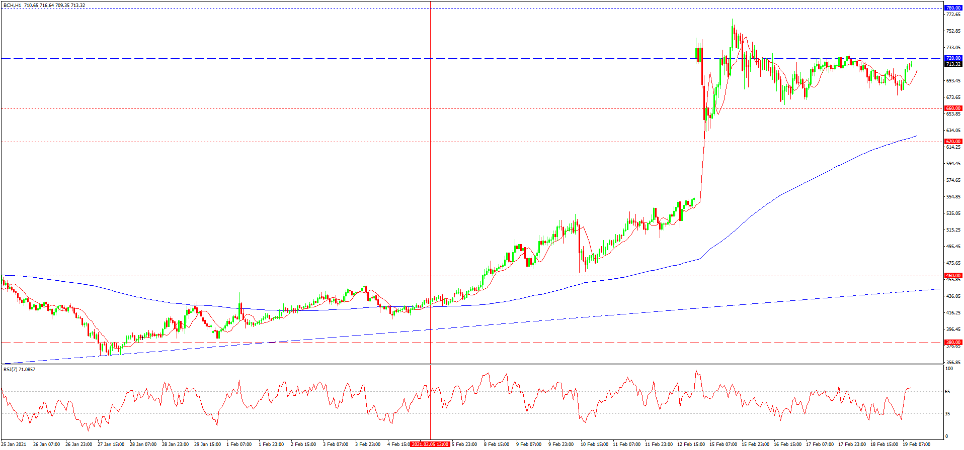 از دفعه گذشته به تاریخ 05 فوریه که در مورد این رمزارز نوشته بودیم، قیمت بر فراز خط روند صعودی فشرده شده بود و با احتمال ادامه یابی افزایش رو به رو بودیم. افزایش قیمت ادامه پیدا کرد، نرخ گذاری ها تا ماکسیموم 620 و حتی 760 دلار هم افزایش پیدا کردند. این روند اخیرا با فشردگی نوسانی رو به رو شده که بیشتر شبیه به مثلث متقارن می باشد. الگویی که مبنی بر ادامه یابی گرایش است. پتانسیل افت اصلاحی نیز تا مرز 660 به حساب می آید. پایین تر از این سطح در صورت شکست آن به شکل ضربانی می توان با از سر گیری روند صعودی رو به رو شد.