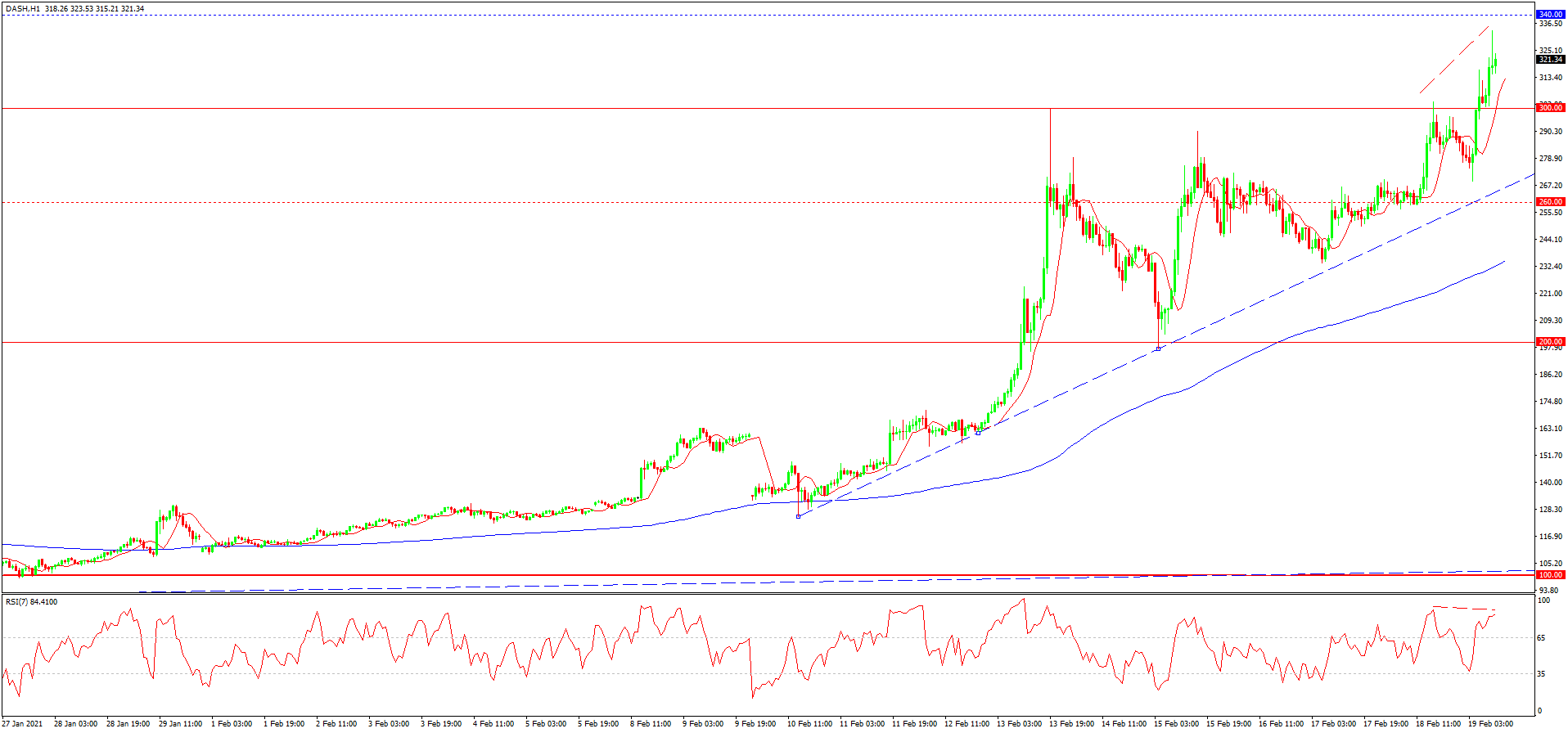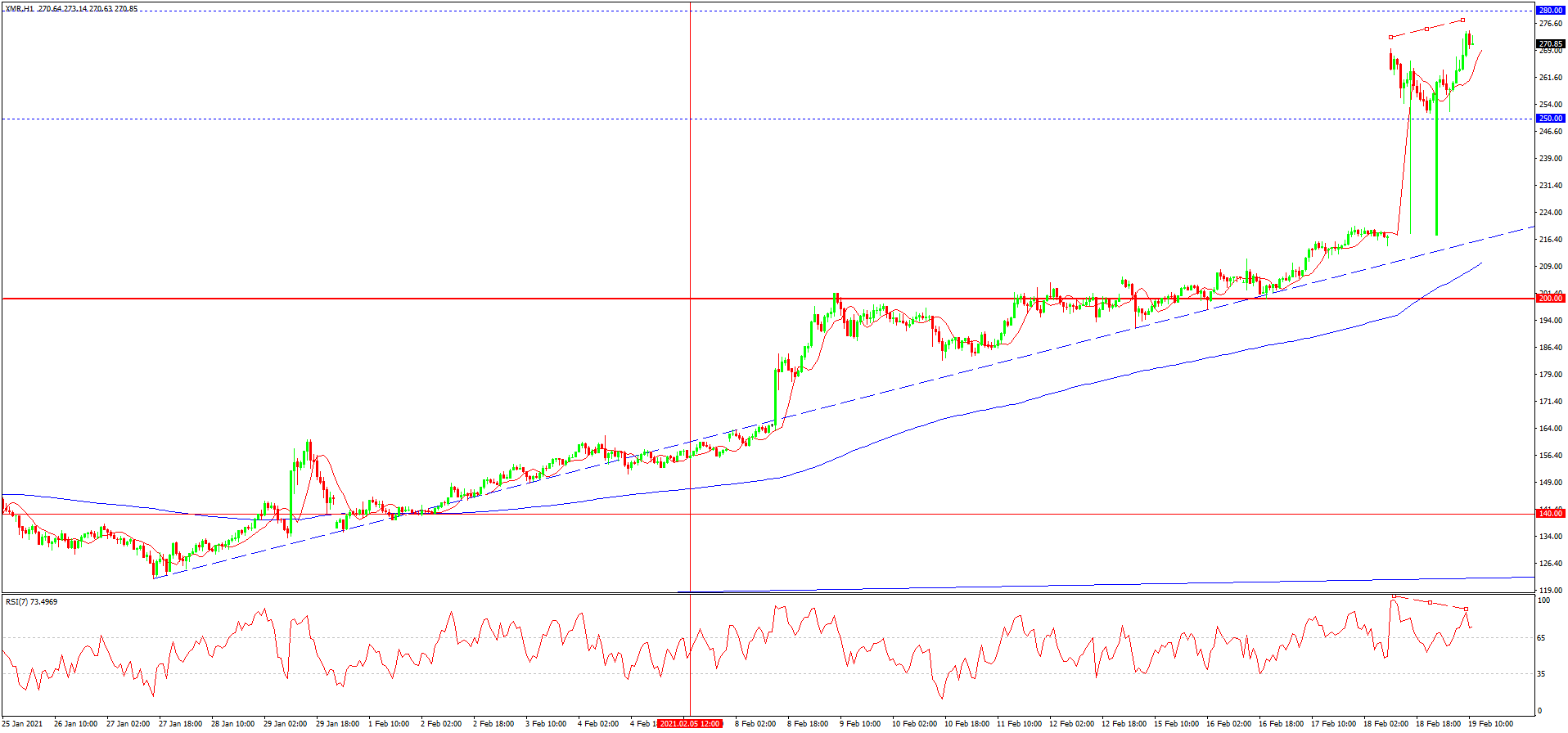 از دفعه گذشته به تاریخ 05 فوریه که در مورد این رمزارز نوشته بودیم، قیمت از مینیموم ها فاصله گرفته بود و با احتمال از سر گیری روند صعودی رو به رو بودیم. روند صعودی شروع شد و بعد از شکست ماکسیموم 180.00 با افزایش بیشتر قیمت تا مرز 280.00 نیز رو به رو شدیم. نرسیده به سطح 300.00 با فشردگی نوسانی و ایجاد واگرایی بین ماکسیموم ها و خط نوسانگر رو به رو شدیم، که نشان دهنده احتمال افت اصلاحی می باشد. پتانسیل این کاهش اصلاحی سطح 250.00 است. در صورت شکست این سطح به صورت ضربانی و با یک کندل سریع، می توان به اصلاحی بودن کاهش، اطمینان داشت و در محدوده 230 آماده برای خرید دوباره شد.
