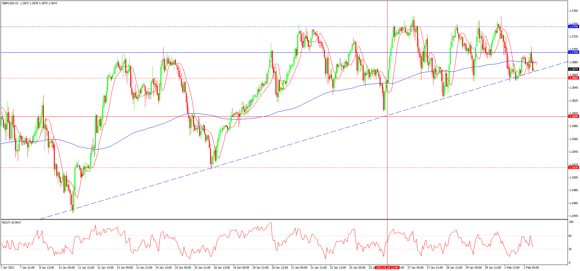 از دفعه گذشته به تاریخ 26 ژانویه که در رابطه با این جفت ارزی نوشته بودیم، نرخ گذاری ها با خط روند صعودی برخورد کرده بودند و با احتمال از سر گیری افزایش دوباره رو به رو بودیم. دیرتر نرخ گذاری ها مقاومت موضعی 1.3740 را شکاندند، ولی تا به کنون با فشردگی نوسانات رو به رو هستیم. این فشردگی به دلیل افزایش های اخیر دلار رخ داد و با در نظر گیری پتانسیل نزولی دلار و برخورد اخیر قیمت این جفت ارزی با خط روند، احتمال از سر گیری روند صعودی پوند افزایش یافته. بازه نرخی 1.3660-1.3620 در آینده می تواند تست شود و پس از آن با از سر گیری روند صعودی رو به رو شویم.