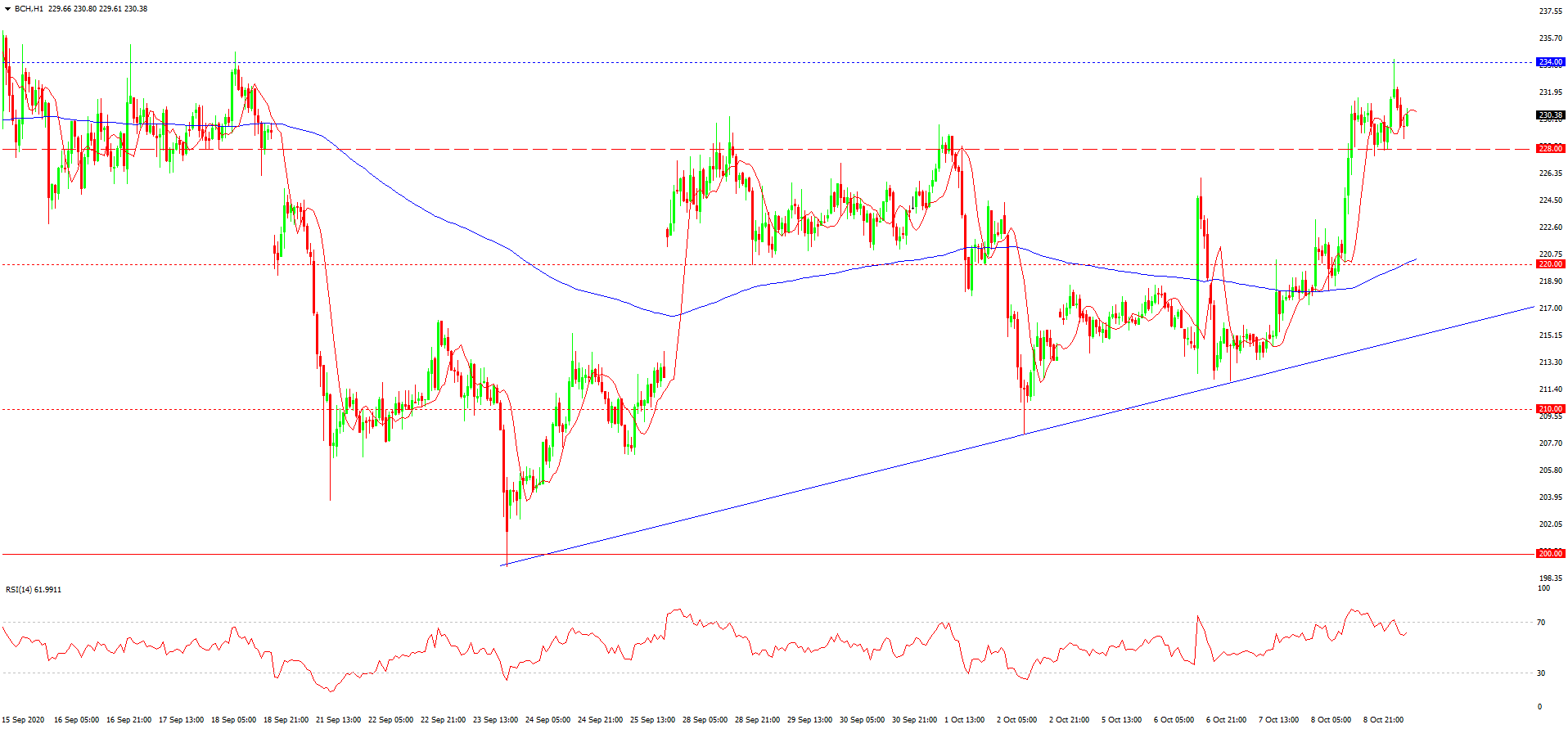 این رمزارز همانند بیتکوین به ماکسیموم موضعی نزدیک شده و به نظر می رسد که آن را تست نموده. به همین دلیل در حوالی مقاومت موضعی 234.00-240.00 می توان با افت اصلاحی و موقت رو به رو شد. پتانسیل این افت نهایتا تا مرز خط روند و پشتیبانی 228.00 می باشد. پایین تر از این سطح شکست ضربانی می تواند افت تا مرز 210.00 را به همراه داشته باشد. احتمال چنین افتی در آینده نزدیک کم است، به همین دلیل به موازات اتمام یابی کاهش اصلاحی می توان با از سر گیری افزایش تا مرز 240.00 و 250.00 رو به رو شد.