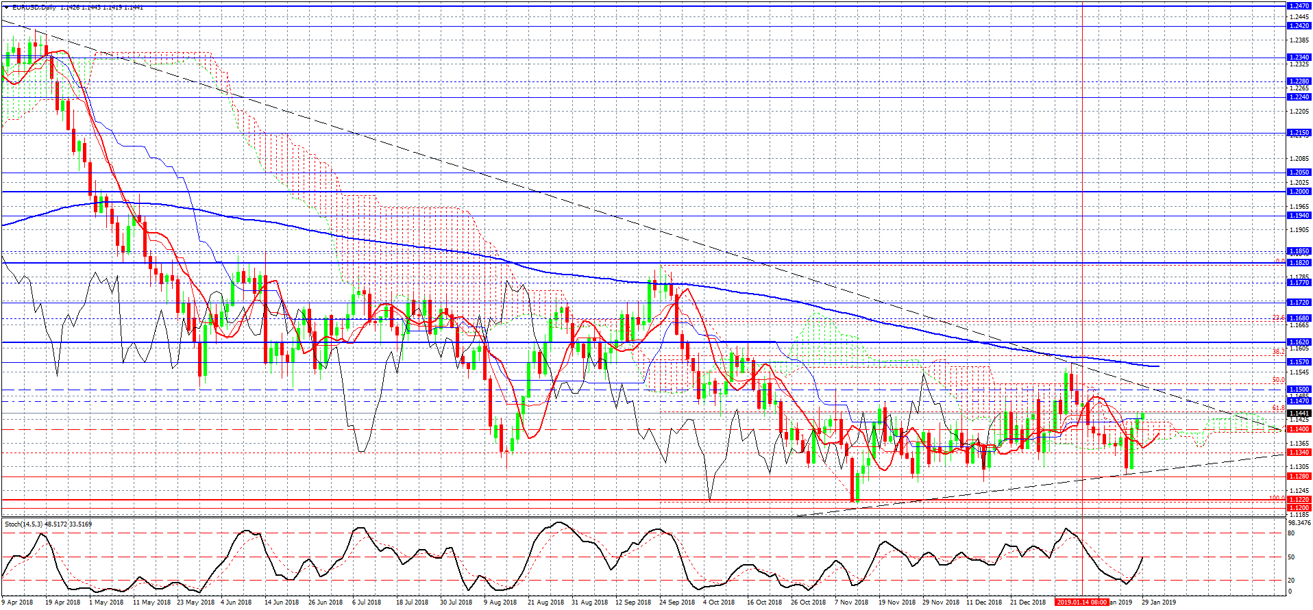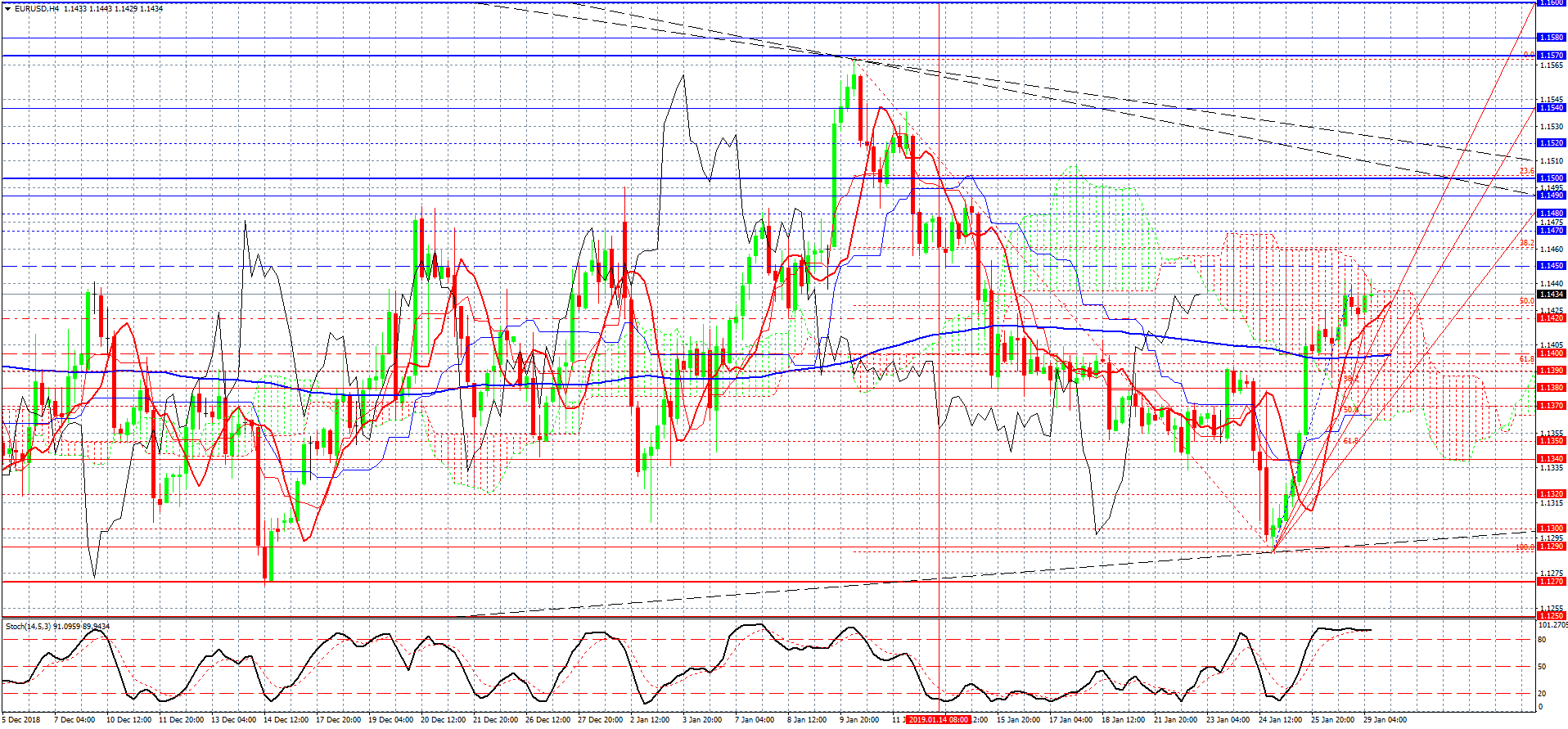 طبق ارزیابی های مقاله ی قبلی، فشردگی نرخ نوسانات تحت فشار خط ترند نزولی - شکل گیری ضربان کاهشی مابعد نرخ گذاری ها تا شکست خط EMA-200 (H4)، به موازات سطوح 1.1400/20 و تست استقامتی مابعد خط ترند افزایشی (کلی)، به موازات سطوح 1.1370/40 را، به دنبال داشته است. در پی تست استقامتی مابعد خط ترند یاد شده از سمت پایین، نرخ گذاری ها انعکاس نزولی یافتند و تا بازه ی پشتیبانی 1.1300/1.1280 (بازه ی مینیموم موضعی مندرج در نمودار Daily مقاله ی قبلی)، افت نمودند. همانطور که دیرتر انتظار می رفت، عامل شدت یابی این افت موقت (میان مدت)، ورود خطوط شاخص نوسان گر 24 ساعته ی stochastic، به محدوده ی اشباع فروش، رقم خورد. اما خروج مابعد خطوط این شاخص از محدوده ی یاد شده، اتمام گرایش نزولی نرخ گذاری ها، پس از نفوذ کاذب شان به خط ترند افزایشی (کلی) را، به همراه داشت. گرایش افزایشی (کلی) نرخ گذاری ها از اواسط نوامبر سال 2018 سرچشمه می گیرد. اما هم اکنون با نزدیک شدن نرخ گذاری ها به خط ترند کاهشی (جهانی) رو به رو هستیم، که از اواخر مارچ 2018 آغاز یافته.