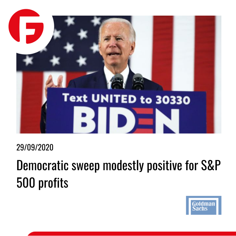 تحلیلگران گلدمن ساکس اخیرا بیان کردند که پیروزی نامزد دموکرات "جو بایدن" در انتخابات ریاست جمهوری ایالات متحده و کنترل آتی سنا به دست دموکرات ها سیگنالی مثبت برای شاخص سهام ایالات متحده به حساب می آید. روندی که حتی تا سال 2024 نیز ادامه خواهد یافت. بانک سرمایه گذاری گفت که پیش بینی فعلی کاملاً در تضاد با انتظارات اکثر اعضای بازار است. گلدمن ساکس با توجه به پیش بینی درآمد پایه شاخص سهام تا سال 2024 احتمال افزایش %4 درآمد بازار بورس را می دهد که تحت سیاست گذاری های آتی دموکرات ها امکان پذیر خواهد بود. از نظر درآمد، روی کار آمدن دموكرات ها می تواند تأثیر نسبتاً مثبتی برS&P 500 داشته باشد. در چشم انداز میان مدت عواملی همچون کشف واکسن، روند بهبود اقتصادی و سیاست گذاری های سیستم ذخایر فدرال در تعیین ارزش سهام بیشتر از نتیجه انتخابات مهم خواهند بود. نتیجه انتخابات نوامبر باید در هر صورت افزایش سهام را به دنبال داشته باشد.
