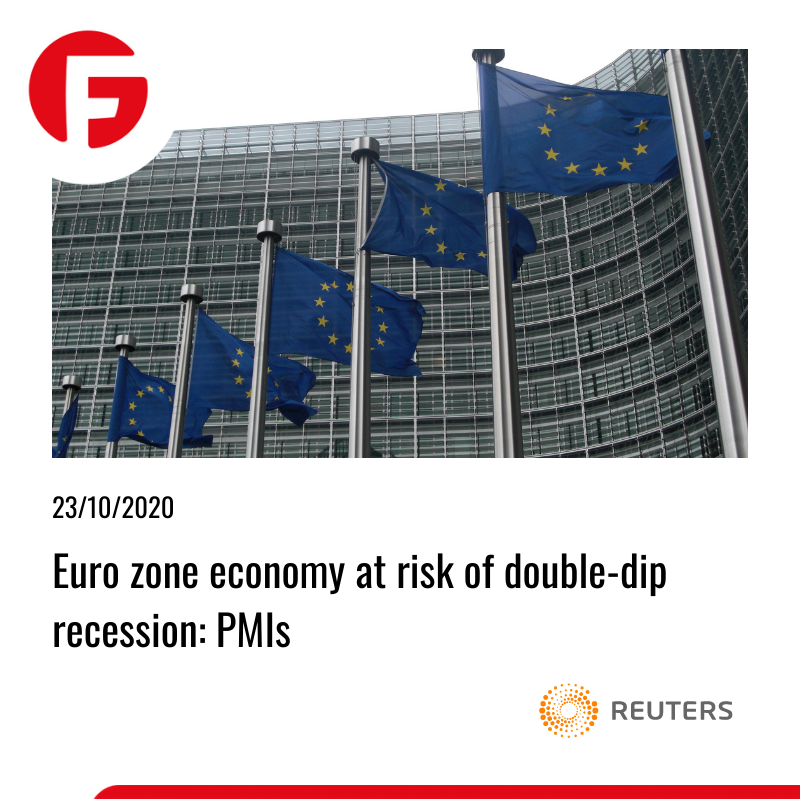 فعالیت اقتصادی منطقه یورو در ماه جاری به دلیل موج دوم ویروس کرونا در سراسر قاره، احتمال رکود اقتصادی را در طی زمستان امسال افزایش داده. آمار امروز PMI کسب و کار این منطقه گویای این مطلب بودند. شاخص های اصلی در حال سقوط هستند و همین مساله احتمال نیاز بانک مرکزی به تصویب محرک های بیشتر را افزایش خواهد داد. مسلما احتمال تضعیف متقابل یورو، به دلیل افزایش احتمالی نقدینگی نیز بیشتر خواهد شد، که شاید بتواند از کاهش بیشتر شاخص دلار، پایین تر از مینیموم های موضعی جلوگیری کند.