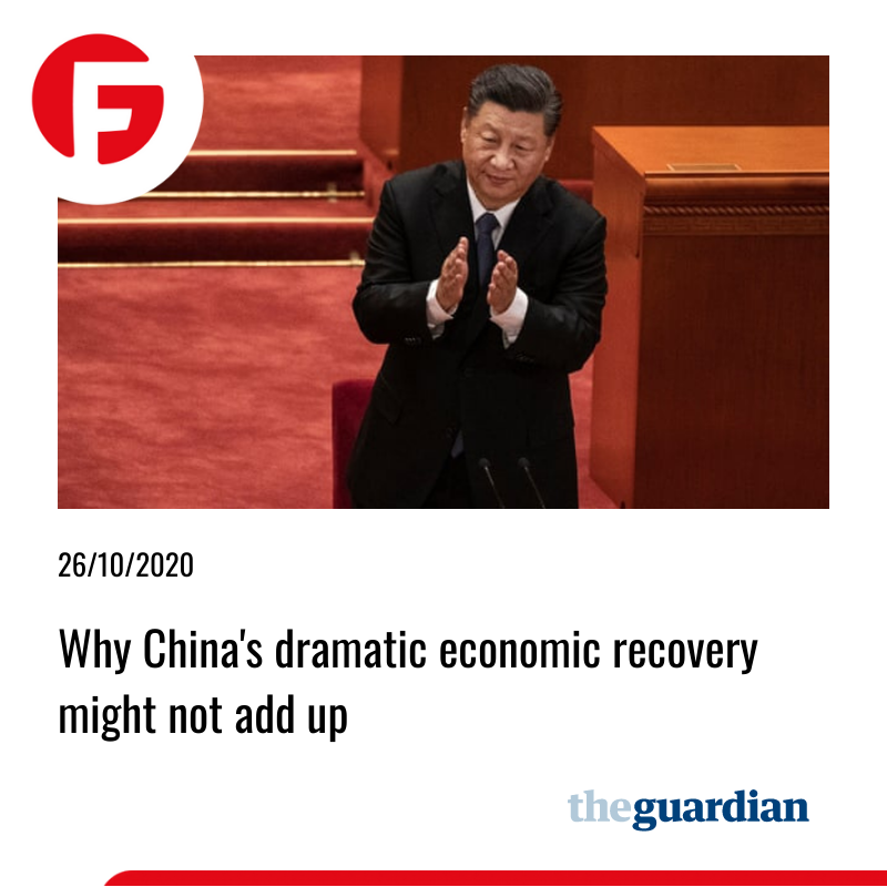 با وجود بهبود اقتصادی اخیر چین برخی از تحلیلگران بر این باورند که حداقل دست کاری در آمار این کشور به عمل آمده. از سویی آمار اخیر چین حسادت اروپا و آمریکا را تشدید کرده، اما از سویی دیگر، به دلیل بسته تر شدن این کشور و عدم وجود رقابت خارجی، چنین شکی از طرف تحلیلگران منطقی است. بهبودی V شکل، موفقیتی که حتی اقتصاد آمریکا هم برای تحقق آن ناتوان است، مدالی می باشد که چین همواره ادعای مالکیت آن را می کند. البته واقعا این کشور عاری از موج دوم و سوم بود، حتی آمار تولیدات ناخالص داخلی اواخر تابستان هم کمتر از حد انتظار ولی با بار مثبت بیرون آمد. در حال حاضر اقتصاد چین نه بر سرمایه گذاری بلکه بر مصرف متکی است. همین مساله باعث افشای چند سری دست کاری در آمار شده، که برخی از تحلیلگران از آن خبر می دهند. طبق نظریه متخصصین، همین موارد باعث ایجاد حباب های وامی و افزایش قرضه دولت در آینده می شوند. البته فعلا تاثیر آنها شاید تا 3-5 سال آتی هم معلوم نشود.