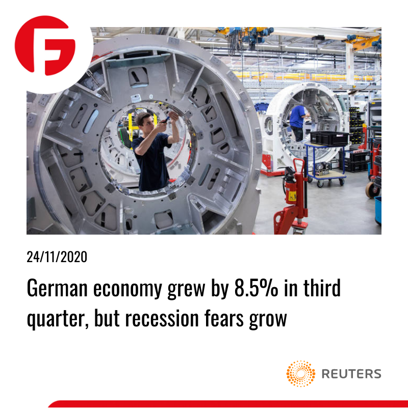 اداره آمار روز سه شنبه گفت، تولیدات ناخالص داخلی آلمان در سه ماهه سوم با رکورد %8.5 رشد کرد. بزرگترین اقتصاد اروپا تا حدی بهبود یافته. اقتصاد آلمان توانست تا قسمت عمده ای از رکود گسترده در تولید ناخالص داخلی ناشی از قرنطینه را جبران کند. چشم انداز ادامه یابی این روند مشخص نیست. چرا که طبق نظریه پزشکان به تعویق انداختن قرنطینه و یا جدی نگرفتن آن، پروسه قرنطینه را طولانی تر کرده و همین امر باعث ریزش دوباره اقتصاد می شود. رستوران ها، بارها، هتل ها و اماکن تفریحی از 2 نوامبر در آلمان بسته شده اند. اما مغازه ها و مدارس همچنان باز هستند. آنگلا مرکل، صدراعظم آلمان در صدد است تا قرنطینه سراسری را به زودی اعمال کند. انتظار می رود که رکود در سه ماهه چهارم در بخش خدمات به شدت بر تولید ناخالص داخلی تأثیر بگذارد. کاهش تولیدات اقتصادی در آینده امکان پذیر می باشد. آلمان و بسیاری از کشور های تجاری منطقه احتمالاً به رکود اقتصادی دچار خواهند شد.