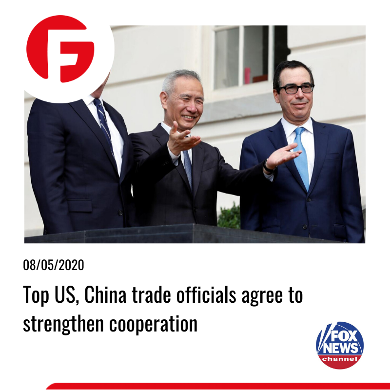 نمایندگان تجاری ارشد ایالات متحده و چین در روز جمعه در مورد تقویت معامله تجاری فاز 1 خود با چین گفتگو کردند. ایشان توافق کردند که جو اقتصادی و سیاسی را برای اجرای این توافق نامه بهبود بخشند. ایالات متحده می گوید هر دو طرف انتظار دارند تعهدات برآورده شود. بحث و گفتگو در تماس تلفنی در حالی آغاز می شود که تنش بین کشورها تشدید یافته. رئیس جمهور آمریكا، دونالد ترامپ و دیگر مقامات ارشد، چین را مقصر كشته شدن صدها هزار نفر بر اثر شیوع ویروس دانستند و اقداماتی تحریمی از جمله تعرفه های احتمالی و جابجایی زنجیره های تأمین از چین را تعبیه دیدند. وزیر تجارت چین گفت: نماینده تجارت آمریكا رابرت لایتهیزر و وزیر امور خارجه خزانه داری ایالات متحده استیون منوچین در طول فراخوان موافقت كردند كه دو كشور همكاری كنند تا بتوانند محیط مساعدی را برای اجرای توافق نامه تجاری فاز 1 را سال جاری ایجاد كنند.