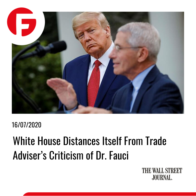 آنتونی فاوچی، متخصص بیماریهای عفونی و دستیار رئیس جمهور ایالات متحده روز چهارشنبه، تلاش کاخ سفید برای بی اعتبار کردن وی را "عجیب" خواند و خواستار پایان دادن به تفرقه افکنی و جلوگیری از شیوع بیشتر بیماری شد. فاوچی که بعد از شیوع ویروس به چهره ای محبوب و قابل اعتماد تبدیل شده است، مورد انتقاد رئیس جمهور دونالد ترامپ و برخی از متحدان جمهوری خواه قرار گرفت، زیرا فاوچی نسبت به بازگشایی اقتصاد ایالات متحده منفی نگر است. با توجه به دوآتیشه بودن بیانیه ها و موضع کاخ سفید، فاوچی اظهار نمود: به هر حال، اقتصاد به راه افتاده و ما نمی خواهیم قرنطینه دوباره را به کار بگیریم. به همین دلیل نیاز است تا استراتژی جدیدی را به کار بگیریم. از سویی دیگر تنش های کاخ سفید با فاوچی باعث کاهش محبوبیت ترامپ در نظرسنجی های ریاست جمهوری آتی نیز می شود. در سراسر ایالات متحده در حال حاضر روزانه 60،000 مورد جدید ابتلا به ویروس کشف می شود. مسلما با توجه به عدم اجرای دوباره قرنطینه، نیاز به اجرای استراتژی جدید می باشد، که شاید از سویی دیگر به به بازار سهام ضربه بزند.البته فعلا هنوزهم تاثیر محرک مالی باقی مانده.