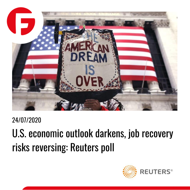 موارد شیوع ویروس در ایالات متحده برای سه روز متوالی در حداکثر قرار دارد. نرخ بی کاری هم اخیرا افزایش پیدا کرده. این مسائل به صورت همزمان هم بورس و هم دلار را تحت فشار قرار داده اند. اقتصاددان ارشد گلدمن ساکس، احتمال تغییر روند اقتصادی کشور را از %33 درصد Q3 به %25 کاهش داده اند. اقتصاددان یاد نمودند که چشم انداز بهبود اقتصادی ایالات متحده یا تقریباً یکسان مانده یا بدتر از ماه گذشته رقم می خورد. در ضمن اپیدمیولوژیست ها معتقد هستند احتمال بروز موج دوم در پاییز/اوایل زمستان وجود دارد. اگر این اتفاق بیفتد فعالیت اقتصادی منفی تر خواهد شد. خروج از بحران به طرز الگوی نموداری W.