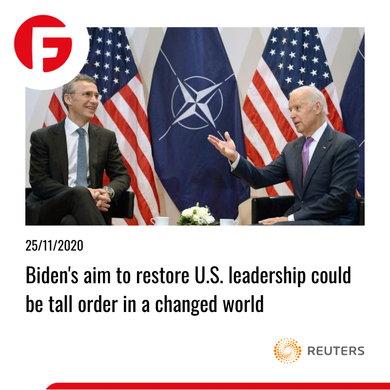 جو بایدن، هدف برگرداندن ایالات متحده در نقش رهبری جهانی را در نظر خواهد داشت. این در حالی است که جنگ تجاری با چین، مونوپولی سیاسی آمریکا را در سطح جهان همواره ضعیف کرده. مسلما اعمال قدرت همانند دوره بوش چندن امکان پذیر نیست. استاد تاریخ دانشگاه سنت لورنس گفت: "هنجارها و اساسی که بایدن در صدد تقویت آنهاست، می توانند در آینده موقعیت آمریکا را به زمانی که از او بسیارحساب می بردند، بازگرداند. البته باید به این توجه داشت که ایالات متحده دیگر مورد خاصی به حساب نمی آید، چرا که طی ریاست جمهوری ترامپ، سعی در این بود تا توازنی بین تمام ابرقدرت های جهان، ایجاد شود تا از این طریق واکنش های شکننده بین استعمارگران رخ ندهد." طی چهار سال گذشته، ایالات متحده با ریاست ترامپ از سازمان بهداشت جهانی، توافق هسته ای ایران و سازمان ناتو خارج شد، در این بین نفوذ روسیه و انگلیس بر مستعمرات شان را افزایش داد. نبردی را با چین آغاز کرد که به تضعیف اقتصاد جهانی منجر شد و با پاندمی شک برانگیز، اتمام یافت. سیاستی که با حمایت از سلطه گران قدیمی جهان، مانع بروز نوآوری اقتصادی و دگردیسی جغرافیا اقتصادی شد. در حال حاضر نیز برگرداندن ایالات متحده به زمان قبل از اوباما چندان ساده نیست و شاید در آینده با چهره کاملا جدیدی از ایالات متحده رو به رو شویم.