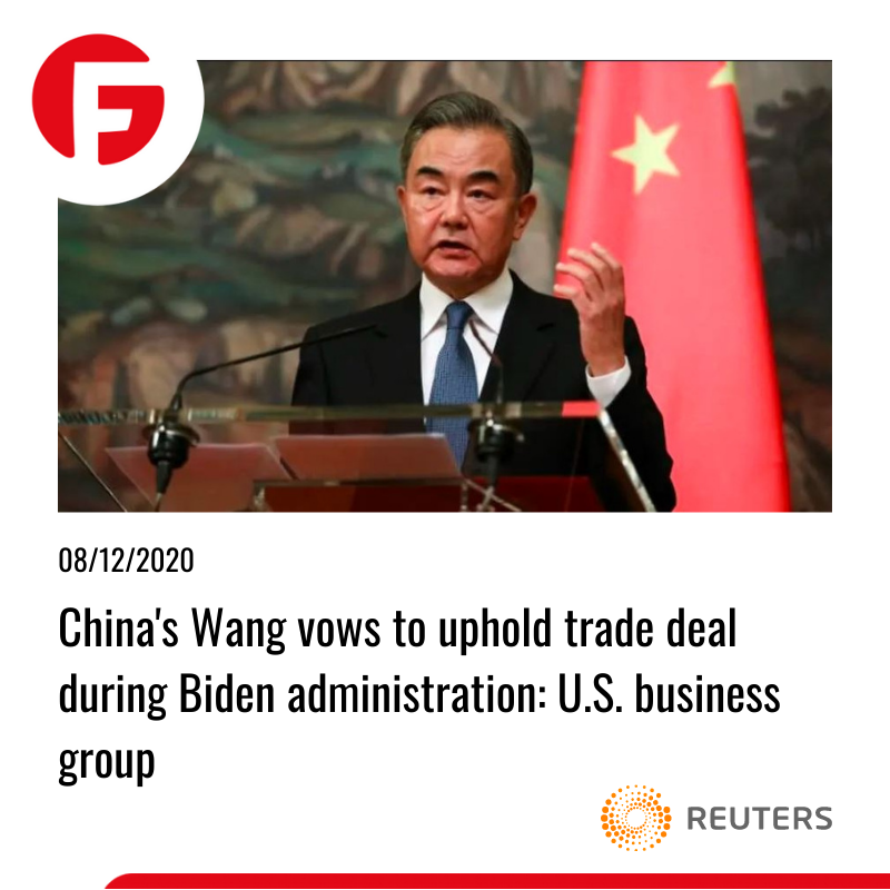 رئیس شورای تجاری ایالات متحده و چین گفت: وزیر امور خارجه چین روز یکشنبه در یک کنفرانس ویدیویی به مدیران ایالات متحده اطمینان داد که پکن همچنان به توافق تجاری فاز 1 با ایالات متحده پایبند است. اظهارات در حالی انجام می گیرند که دولت ترامپ برای سرکوب شرکت های چینی مواضع تند و سخت نسبت به پکن را حفظ کرده. شورای تجارت ایالات متحده و چین اعلام کرد که پیشرفت پکن در اجرای تغییرات سیاسی تحت قرارداد تجاری امضا شده در ژانویه خوشحال کننده است. جو بایدن از 20 ژانویه روی کار می رود و شركتهای آمریكایی قادر به گسترش دسترسی به مهمترین بازار هستند. چرا که چین در سالهای آینده %30 از رشد جهانی را در بر خواهد داشت.