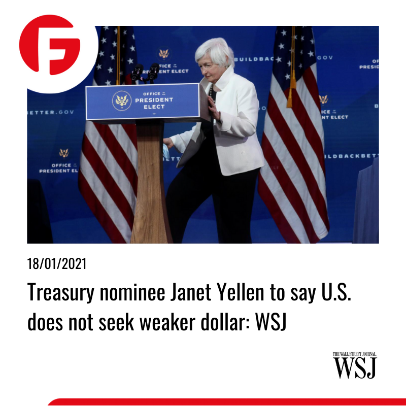 وال استریت ژورنال گزارش داد، جانت یلن رئیس منتخب خزانه داری ایالات متحده، تعهد ایالات متحده به نرخ بهره تعیین شده در بازار را تأیید کرد. وزیر جدید خزانه داری در جلسه تأیید سنا ابراز نمود که ایالات متحده به دنبال دلار ضعیف تر نیست. ایشان اظهار داشت: ارزش دلار آمریکا و سایر ارزها باید توسط بازارها تعیین شود نه سیستم مالی. بازارها از طریق رگولاتور تنظیم می شوند تا عملکرد اقتصادی منفی را منعکس کنند، اما در اکثر اوقات بازار است که باید تصمیم گیرنده باشد. آمريكا به دنبال ارز ضعيف تر برای به دست آوردن مزيت رقابتی نيست.
