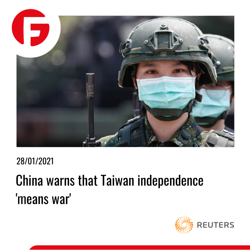 وزارت دفاع چین روز پنجشنبه گفت: فعالیتهای نظامی اخیر در تنگه تایوان پاسخی به دخالت نیروهای خارجی و حمایتکننده استقلال تایوان است. چراکه "استقلال به معنای جنگ" میباشد. افزایش فعالیتهای نظامی اخیر چین توسط تایوان در منطقه پدافند هوایی جزیره گزارش شده است. تایوان بزرگترین خطر برای درگیری ایالاتمتحده و چین است. تایوان مدتهاست که ناپایدارترین مسئله بین ایالاتمتحده و چین به شمار میرود. حفظ این تعادل سختتر شده، زیرا رئیسجمهور چین قدرت بیشتری برای تصاحب آنچه به نظر او قلمرو ازدسترفته کشورش است را به دست آورده. حضور دموکراتها و بایدن در ایالاتمتحده شاید تشنج دیپلماتیک را کاهش دهد، اما بهعنوان حکومت دموکرات حامی تایوان، میتواند به نقض احتمالی حقوق تایوان در آینده واکنش نظامی نشان دهد.