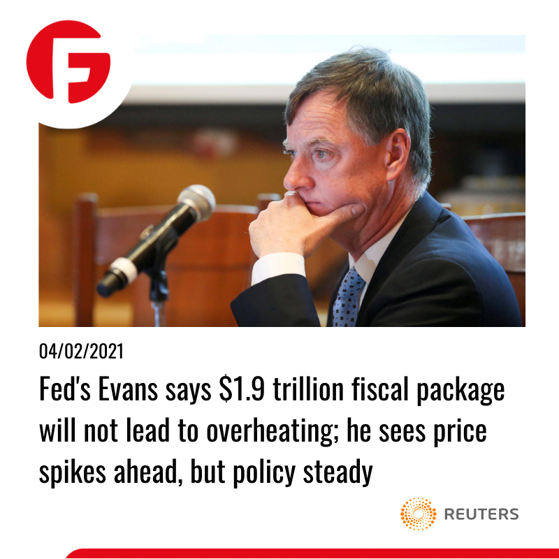 چارلز اوانس، رئیس فدرال رزرو شیکاگو روز چهارشنبه گفت که محرک مالی 1.9 تریلیون دلاری جو بایدن باعث تسریع بهبود اقتصادی و افزایش کنترل شده تورم می شود، بدون اینکه برای ارزش دلار زیان بار باشد. در ضمن ایشان اعتقاد دارد که سیاست مالی برای تورم "خیلی پایین" فعلا تغییر نخواهد کرد، حتی در صورت افزایش بهای مصرف کننده. این سیاست می تواند بهبود سریع تر و افزایش قیمت سهام و اوراق قرضه را به دنبال داشته باشد، در ضمن از کاهش شدید قیمت دلار هم جلوگیری کند. سناریویی که اخیرا مشاهده می کنیم.