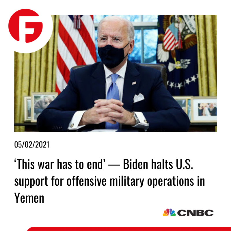 بایدن در اولین سخنرانی خود در رابطه با سیاست خارجی گفت: "جنگ 6 ساله ایران و عربستان باید پایان یابد." "برای همین ما تمام پشتیبانی نظامی ایالات متحده از نیروهای سعودی را قطع می کنیم." این در حالی است که عربستان سعودی با حملات موشکی و پهپادی و تهدیدهای دیگر نیروهای حوثی رو به رو است. در این رابطه بایدن اضافه کرد: ما از حاکمیت و تمامیت ارضی عربستان دفاع خواهیم کرد. بایدن گفت: " USAID برای اطمینان از رسیدن کمک های بشردوستانه به مردم یمن تلاش خواهد کرد." در واقع این حرکت به منظور اتمام بخشیدن به جنگ داخلی یمن صورت گرفته، که به نوبه خود با برگرداندن ثبات موقت می تواند ترس از کاهش شدید عرضه نفتی را نیز از میان بردارد. در این بین تمرکز اصلی نیروهای ائتلاف در منطقه روی شبه نظامیان سنی معطوف خواهد شد.