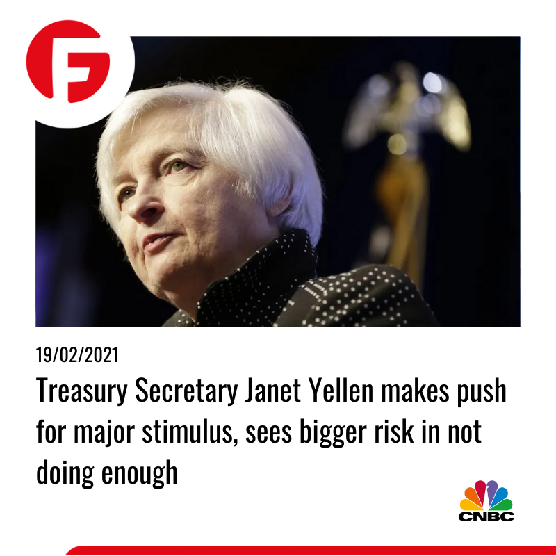 جانت یلن، وزیر خزانه داری آمریکا روز پنجشنبه به CNBC گفت كه تزریق هر چه زودتر محرک مالی به اقتصاد ضروری است. وی اضافه نمود: "در غیر این صورت جوابی را که خواهیم گرفت چند برابر بدتر خواهد بود." علی رغم این که رشد اقتصادی منطقه سریع تر از آنچه در سال 2021 پیش بینی شده بود آغاز یافته. وی گفت: "بیش از یک دهه است که با تورم خیلی پایین دلار رو به رو بودیم و پتانسیل افزایش آن بسیار بالا می باشد." یکی از مسائل مهمی که باعث شده تا چنین نگرانی هایی در بازار ایجاد شود، به دلیل منفی شدن پیش زمینه خبری اخیر ایالات متحده رخ داده. این سناریو اخیرا بازار سهام را هم ناامید کرده و بسیاری از اعضای وال استریت معتقدند که توقع بازار سهام همواره افزایش یافته.