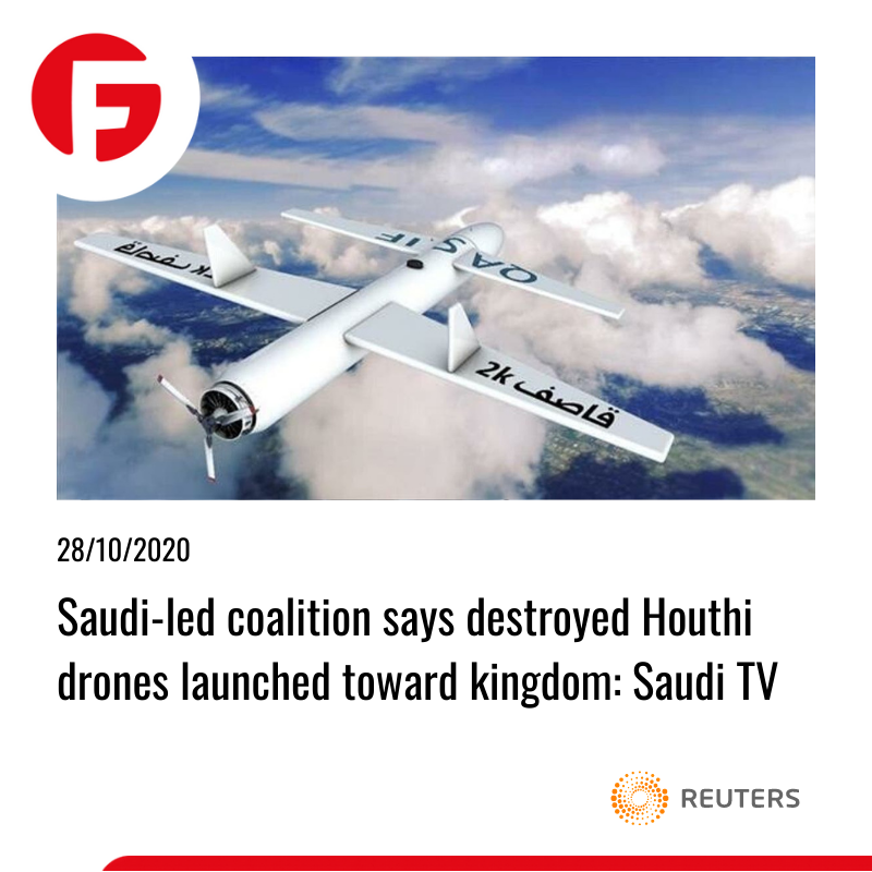 ائتلاف سعودی تعدادی هواپیمای بدون سرنشین، پر از مواد منفجره را که توسط شبه نظامیان یمن تعبیه و به سمت عربستان فرستاده شده بود را، منهدم کرد. مداخله های همبستگان ایران در خاک های نفتی؛ همراه با افزایش ترس از قرنطینه و شروع روند نزولی قیمت نفت شروع شده. البته به نقل از سخنگوی ارتش حوثی: این حمله در پاسخ به محاصره مردم یمن از طریق نیرو های ائتلاف سعودی انجام شد." در همین حال، تلویزیون العربیه متعلق به عربستان سعودی گزارش داد که ائتلاف، بدون ارائه جزئیات بیشتر، یک پهپاد پر از مواد منفجره که شبه نظامیان حوثی از یمن به سمت عربستان سعودی شلیک کرده بودند را رهگیری و منهدم کرد. فشارهایی که افت قیمت نفت بر کانادا، روسیه و شاید عربستان وارد کند، با تاثیرات منفی که تولیدات ناخالص داخلی ایران متحمل خواهد شد قابل مقایسه نیست و تحریم های صادراتی اخیر هم، به احتمال زیاد نظام را مجبور به افزایش تنش در خاورمیانه خواهد کرد.