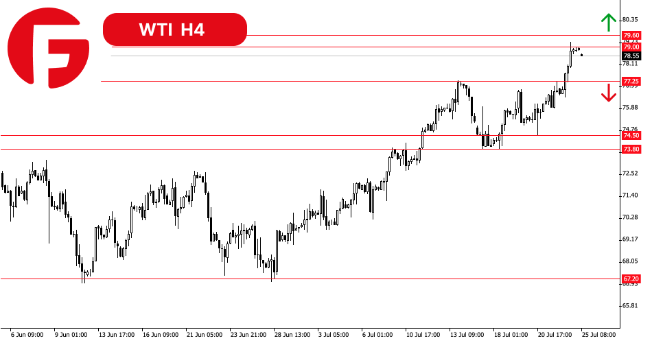 قیمت نفت خام WTI ناحیه مقاومت فنی 79.00 تا 79.60 دلار را آزمایش کردند که دیروز در مورد آن نوشتیم. این مانع خیلی قوی نیست، بنابراین بازگشت قیمتها که مشاهده شده، ممکن است یک کاهش اصلاحی باشد. نزدیکترین سطح حمایتی 77.25 دلار است. تا قبل از شکست و تثبیت قیمت های نفت خام WTI به پایین این سطح، سناریوی صعودی در اولویت باقی میماند.