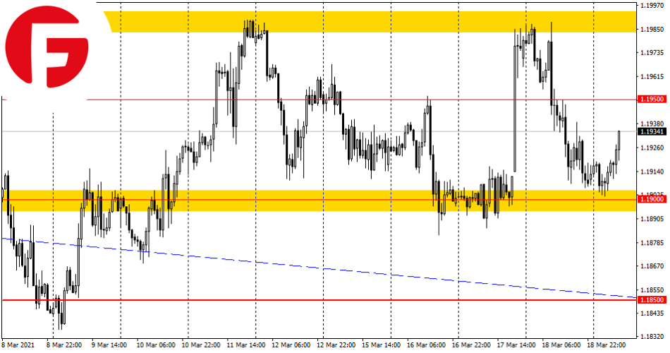 قیمت های این جفت ارز در محدوده فشرده 1.1900 تا 1.2000 قرار دارد، در حالی که مرزهای پایین و بالا توسط مناطق حمایت و مقاومت باریک 10 تا 15 پیپ (Pip) (با رنگ زرد مشخص شده است) تشکیل داده اند. تجارت فعال در این محدوده همچنان دارای ریسک بالایست، چراکه تعیین جهت حرکت قیمت در کوتاه مدت، دشوار است. همچنین لازم است که میزان اشباع کم سابقه اخبار را نیز در نظر گرفت. پیش از این، سطح مقاومت 1.1950 چندین بار وظیفه خودش را انجام داد، بنابراین، در لحظه رسیدن به این نقطه، ممکن است فعالیت خریداران کاهش یابد.