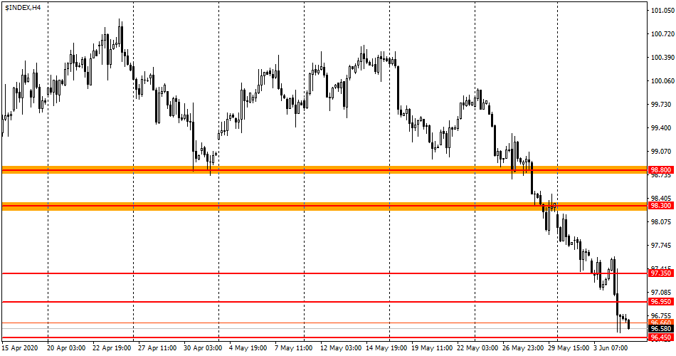 شاخص دلار آمریکا به کاهش ادامه می دهد. نرخ گذاری ها به سطح 96.45 رسیده اند. خطر تضعیف بیشتر قیمت USDX همچنان افزایش یافته است. اعتراضات، سرقت ها و خرابکاری در آمریکا، به دلار آمریکا فشار می آورد. در نتیجه، خطر تضعیف بیشتر USDX وجود دارد. اقتصاددانان انتظار دارند که نرخ بیکاری تا مرز %19.5 افزایش یابد، این امر افت بیشتر قیمت دلار را به دنبال خواهد داشت.