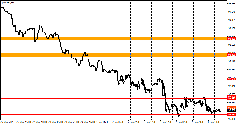 شاخص دلار آمریکا بالاتر از سطح حمایت 96.45 قرار گرفته، شکست این سطح افت بیشتر دلار تا مرز 96.20 را به دنبال خواهد داشت. در عین حال، فعالیت فروشندگان همچنان رو به کاهش است و در نتیجه احتمال از سرگیری حرکت صعودی موقتا افزایش یافته. نزدیکترین مقاومت شامل محدوده نرخی 96.95-97.00 است. شکست این مقاومت راه را برای 97.55 باز خواهد کرد.