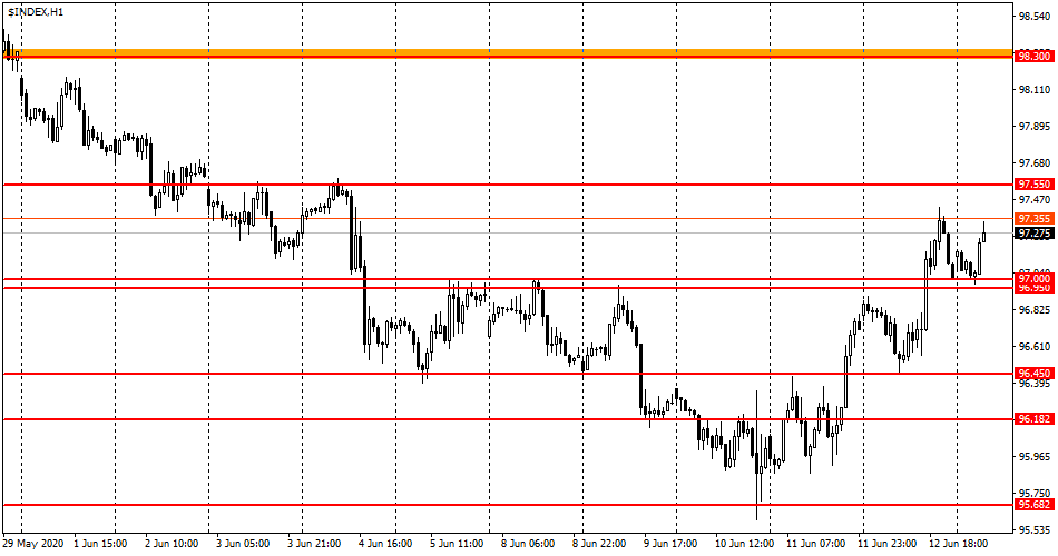 پس از آزمایش منطقه پشتیبانی 96.95-97.00، فعالیت خریداران و تقاضا به میزان قابل توجهی تقویت یافت. در همین حال، اشباع پایین اخبار اروپا و ایالات متحده به کاهش نوسانات نرخی USDX خواهد انجامید. در نتیجه، تقویت یابی قیمت دلار آمریکا ممکن است ناشی از افزایش تقاضا دارایی های حفاظتی و کاهش قیمت شاخص های بورس باشد. شاخص های اصلی سهام ایالات متحده، که در که در حال کاهش می باشند - سیگنالی مثبت برای USDX به شمار می روند.